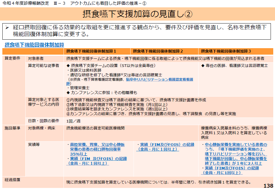 (3) 令和4年3月31日時点で「診療報酬の算定方法の一部を改正する件」による改正前(令和4年度改定前)の医科点数表区分番号「H004」摂食機能療法の「注3」に掲げる摂食嚥下支援加算の施設基準に係る届出を行っている保険医療機関においては、令和4年9月30日までの間に限り、1の(1)のイにおける「専従の常勤言語聴覚士」については「専任の常勤言語聴覚士」であっても差し支えないこととし、また、1の(4)の基準を満たしているものとする。
