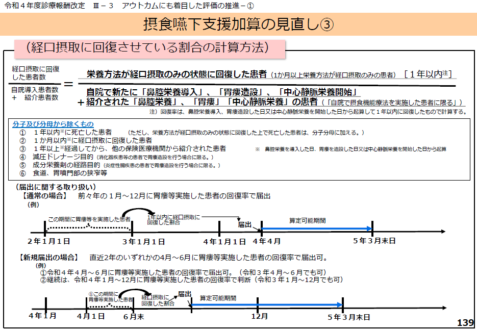 (4) 当該保険医療機関において経口摂取以外の栄養方法を行っている患者であって、以下のいずれかに該当するもの(転院又は退院した患者を含む。)の合計数に占める鼻腔栄養を導入した日、胃瘻を造設した日又は中心静脈栄養を開始した日から1年以内に経口摂取のみの栄養方法を行っている状態へ回復させた患者の割合が、前年において3割5分以上であること。