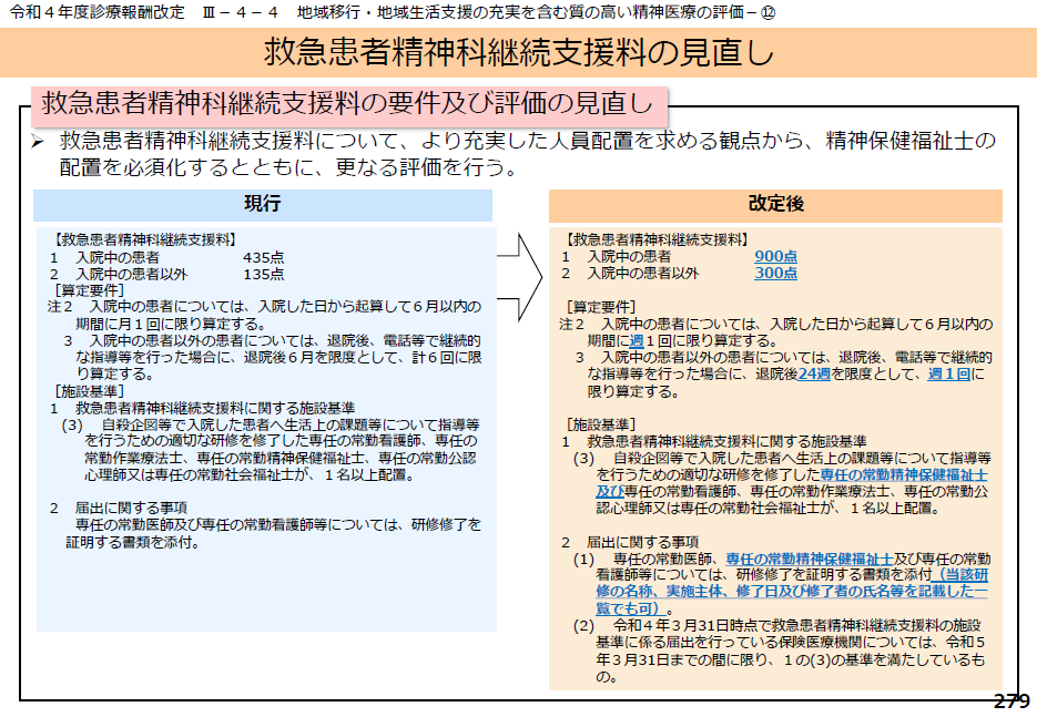 注1 別に厚生労働大臣が定める施設基準に適合しているものとして地方厚生局長等に届け出た保険医療機関において、精神疾患を有する患者であって、自殺企図等により入院したものに対し、生活上の課題又は精神疾患の治療継続上の課題を確認し、助言又は指導を行った場合に算定する。