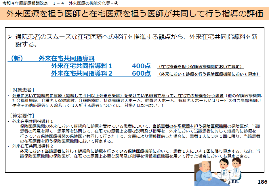 注1 1については、保険医療機関の外来において継続的に診療を受けている患者について、当該患者の在宅療養を担う保険医療機関の保険医が、当該患者の同意を得て、患家等を訪問して、在宅での療養上必要な説明及び指導を、外来において当該患者に対して継続的に診療を行っている保険医療機関の保険医と共同して行った上で、文書により情報提供した場合に、患者1人につき1回に限り、当該患者の在宅療養を担う保険医療機関において算定する。