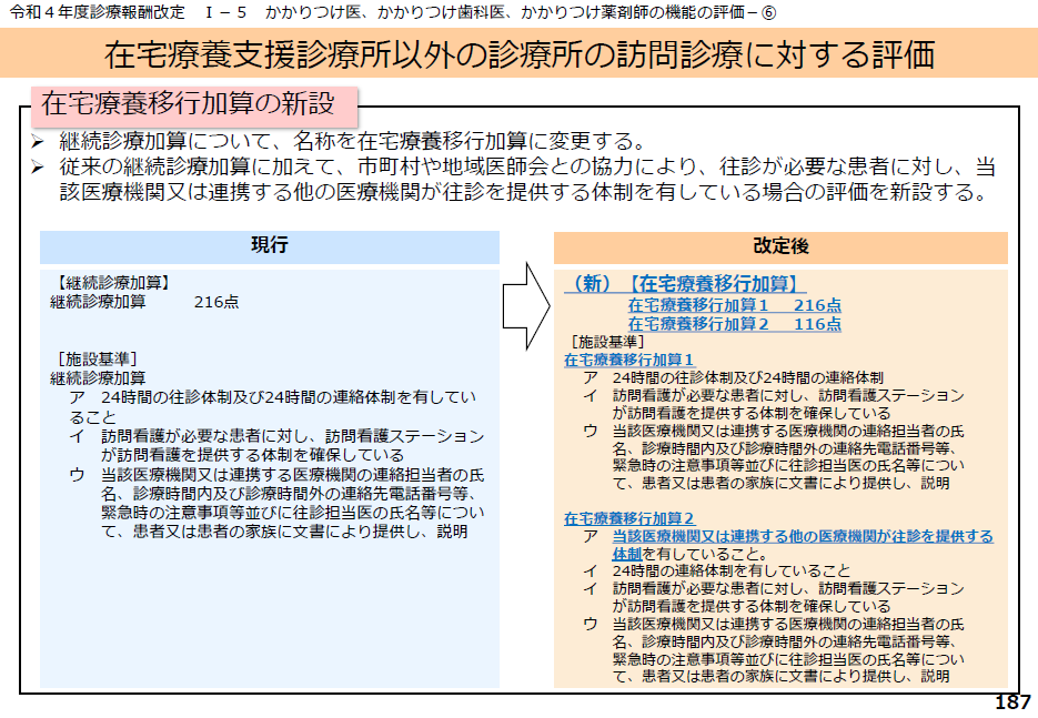 4 在宅医療に移行後、当該点数を算定した日の属する月から起算して3月以内の期間、月1回に限り、在宅移行早期加算として、100点を所定点数に加算する。ただし、在宅医療に移行後、1年を経過した患者については算定しない。