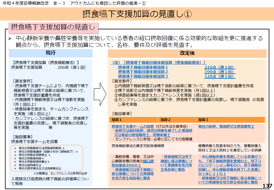 3 別に厚生労働大臣が定める施設基準に適合しているものとして地方厚生局長等に届け出た保険医療機関において、摂食機能又は嚥下機能の回復に必要な指導管理を行った場合は、摂食嚥下機能回復体制加算として、当該基準に係る区分に従い、患者(ハについては、療養病棟入院料1又は療養病棟入院料2を現に算定しているものに限る。)1人につき週1回に限り次に掲げる点数を所定点数に加算する。