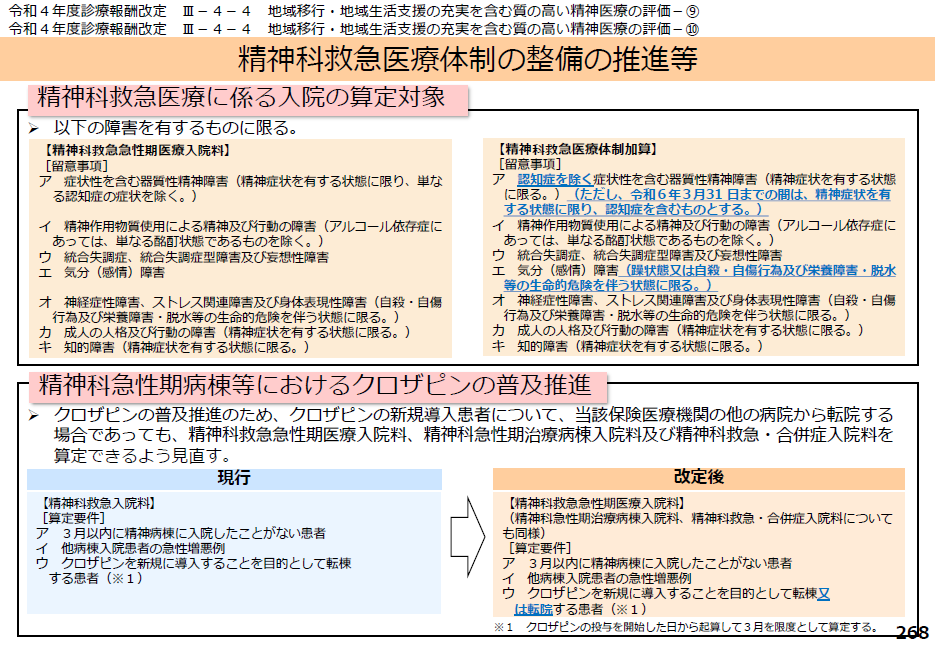 ウ ア及びイにかかわらず、クロザピンを新規に導入することを目的として、当該入院料に係る病棟を有する保険医療機関において、当該保険医療機関の他の病棟(精神科救急急性期医療入院料、精神科急性期治療病棟入院料及び精神科救急・合併症入院料を算定する病棟を除く。)から当該病棟に転棟した患者又は他の保険医療機関(精神科救急急性期医療入院料、精神科急性期治療病棟入院料及び精神科救急・合併症入院料を算定する病棟を除く。)から当該病棟に転院した患者
