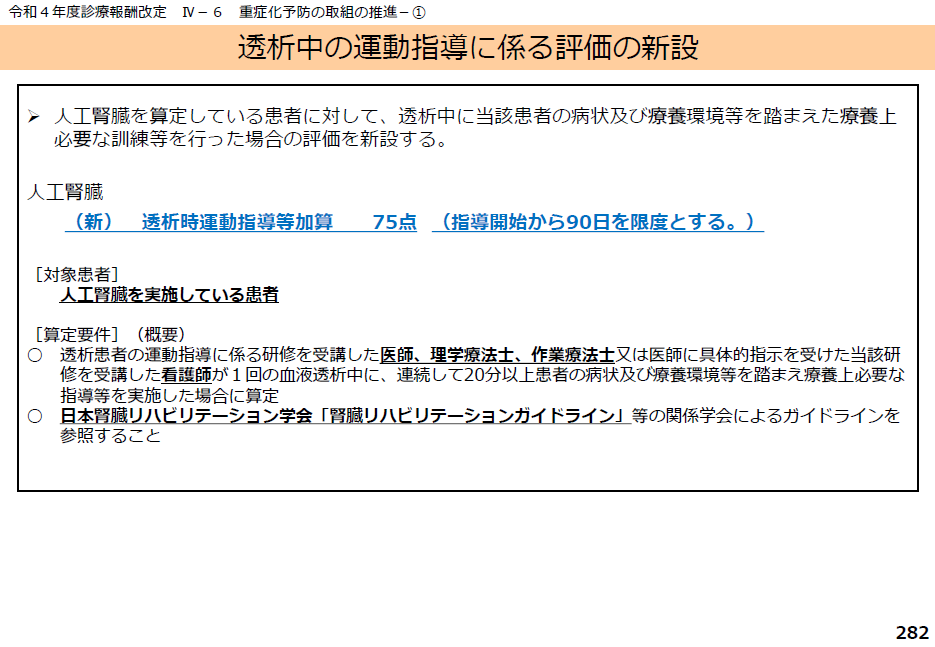 14 人工腎臓を実施している患者に対して、医師、看護師、理学療法士又は作業療法士が、療養上必要な訓練等について指導を行った場合には、透析時運動指導等加算として、当該指導を開始した日から起算して90日を限度として、75点を所定点数に加算する。
